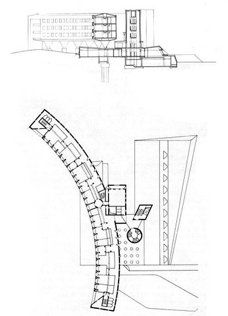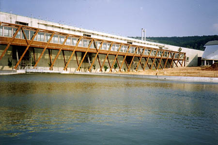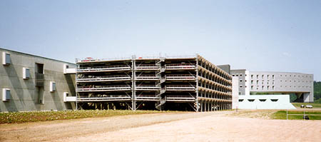 Meine Leistung als freier Mitarbeiter: Koordinator aller Bauteile für die Ingenieurseite in regelmäßigen Bausitzungen und 3 Bauteile in Ausführungsplanung: 1. Verwaltungsgebäude mit EDV-Untergeschoß. 2. Lange Holzbrücke neben Parkhaus zur Kantine. 3. Auf und Abfahrts-Rotunden zum Parkhaus.